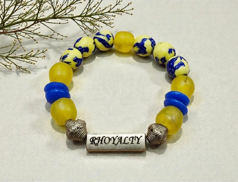 Each bracelet is handcrafted using recycled glass beads, thoughtfully paired with brass accents and a custom brass plate engraved with meaningful details such as a founding year, symbolic animal, or phrase that reflects the heart of each Divine Nine organization. Together, these elements tell a story of resilience, identity, and collective pride.