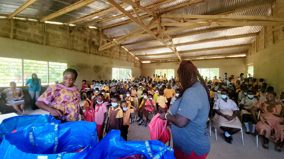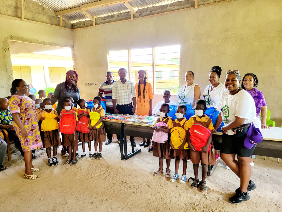 In 2022, Ayebea's Sankofa Marketplace contributed 200 backpacks filled with essential school supplies to New Powmu Elementary School.