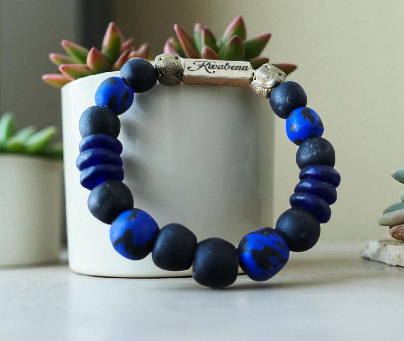 Discover our collection of artisanal bracelets crafted from recycled glass, each bearing the significance of Ghanaian day names.