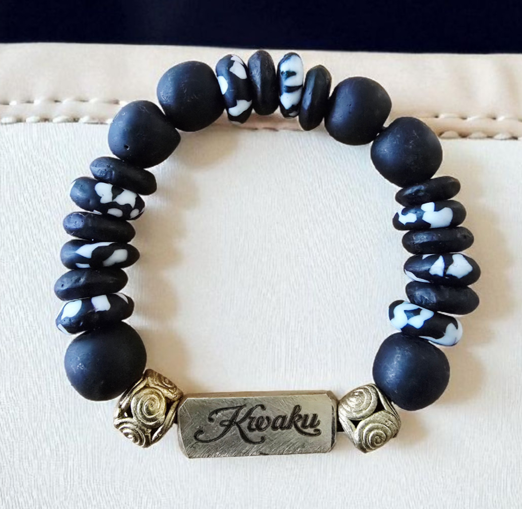 Discover our collection of artisanal bracelets crafted from recycled glass, each bearing the significance of Ghanaian day names.