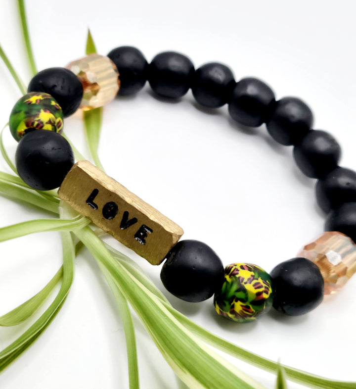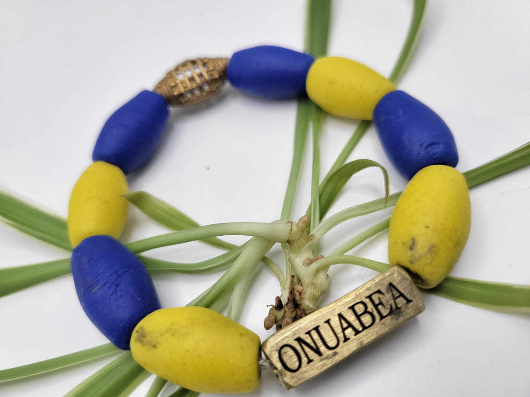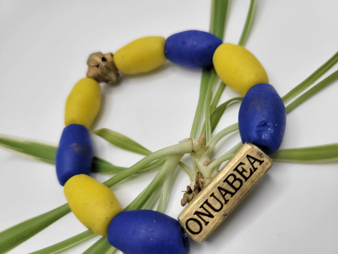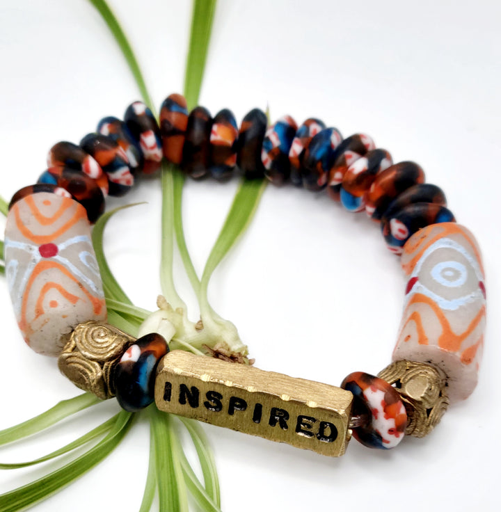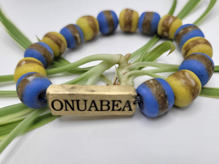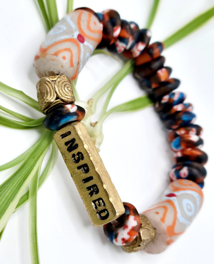 The "Asempa Band" is a thoughtfully crafted bracelet collection that embodies the essence of sustainability, creativity, and inspiration. Each piece in this collection is meticulously designed with a combination of recycled glass and brass plates, creating a harmonious blend of eco-friendly materials and artistic expression.