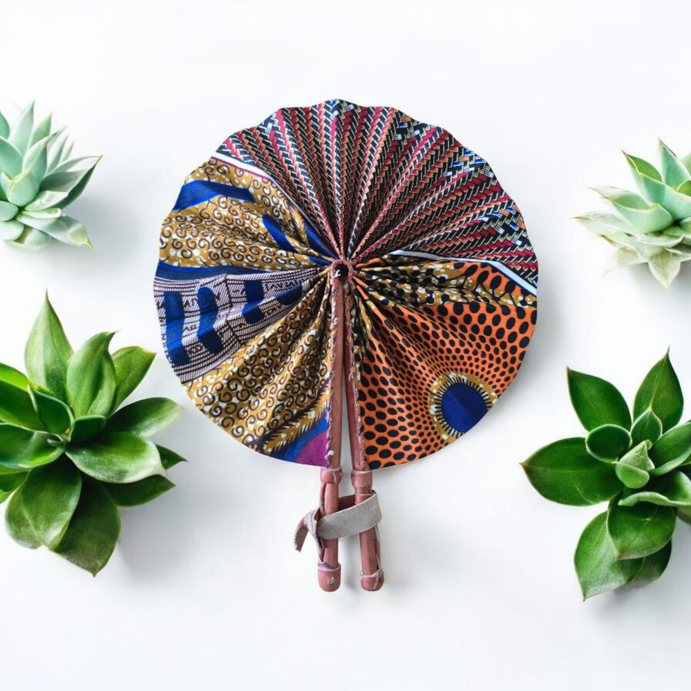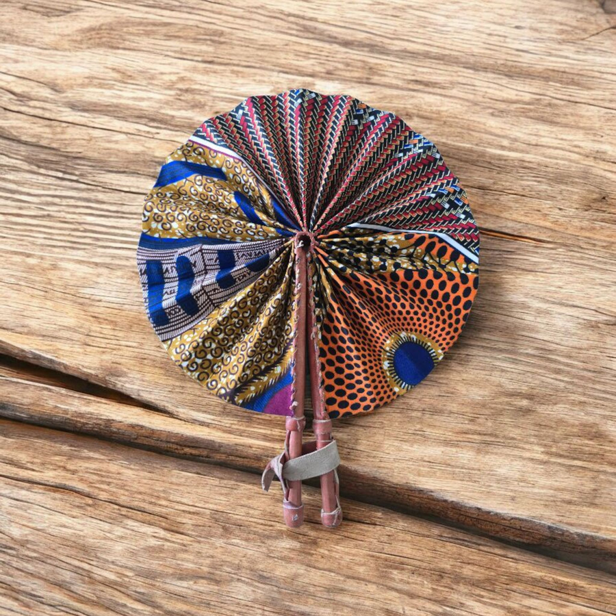 Each fan showcases vibrant Ankara fabric and traditional Ghanaian craftsmanship, making it a cooling accessory and a piece of art.