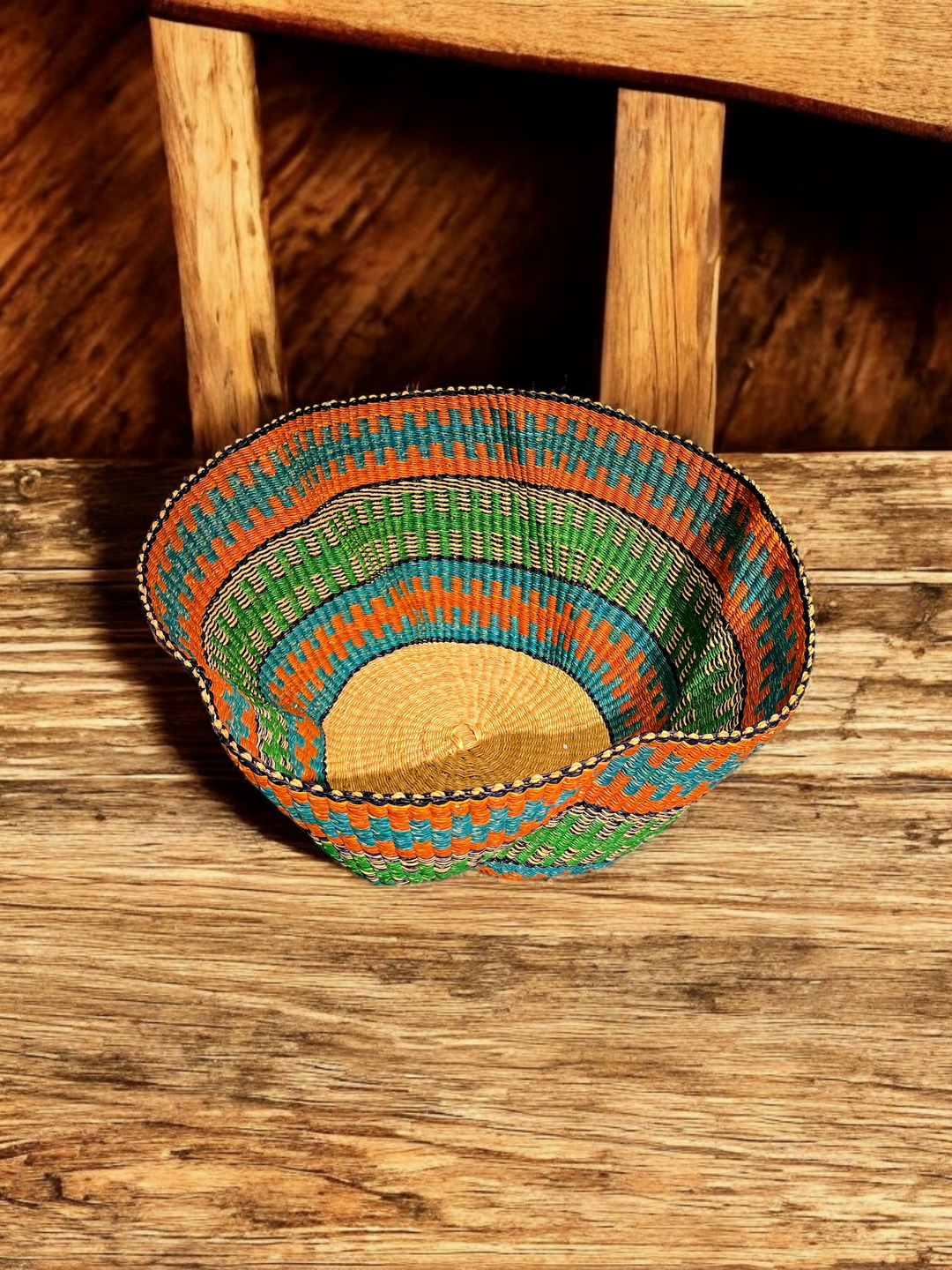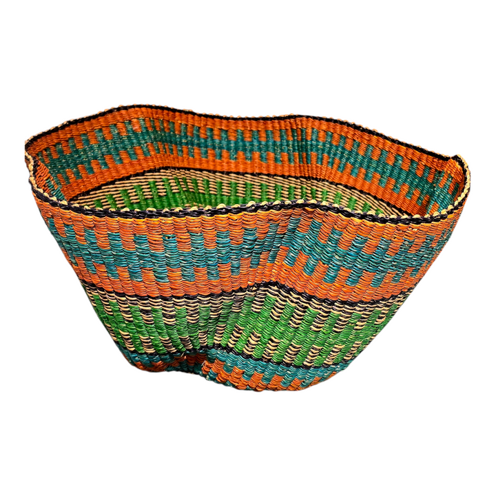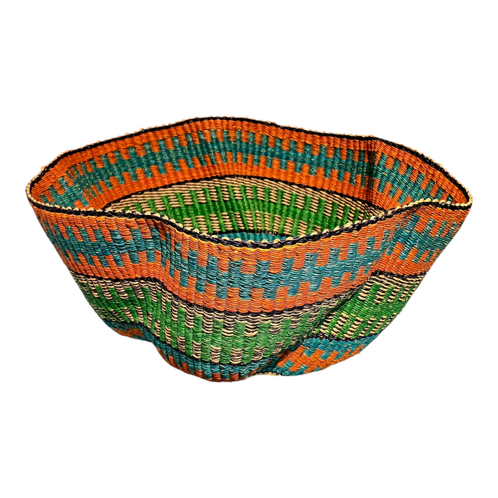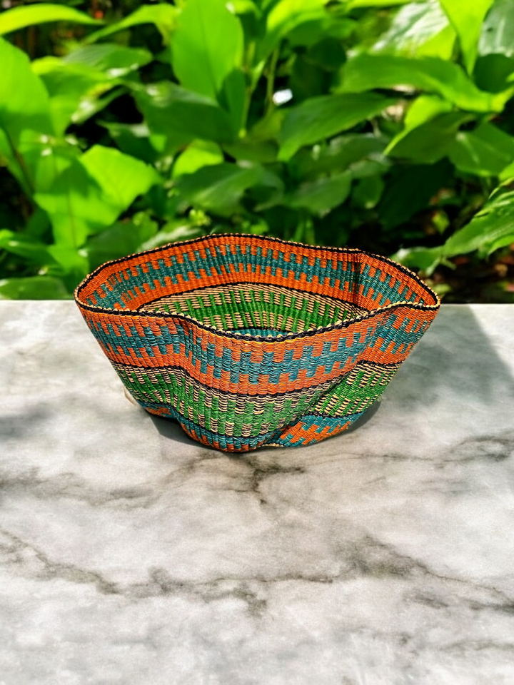 Handwoven with care by the talented women of Ayebase in Bolgatanga, Ghana, the Harmony Wave Basket is a true celebration of craftsmanship and culture. Its elegant curves and intricate patterns make it both a functional piece and a stunning work of art. Perfect for serving fruit, organizing essentials, or adding a decorative touch to any space, this basket reflects the beauty of tradition and sustainable design.