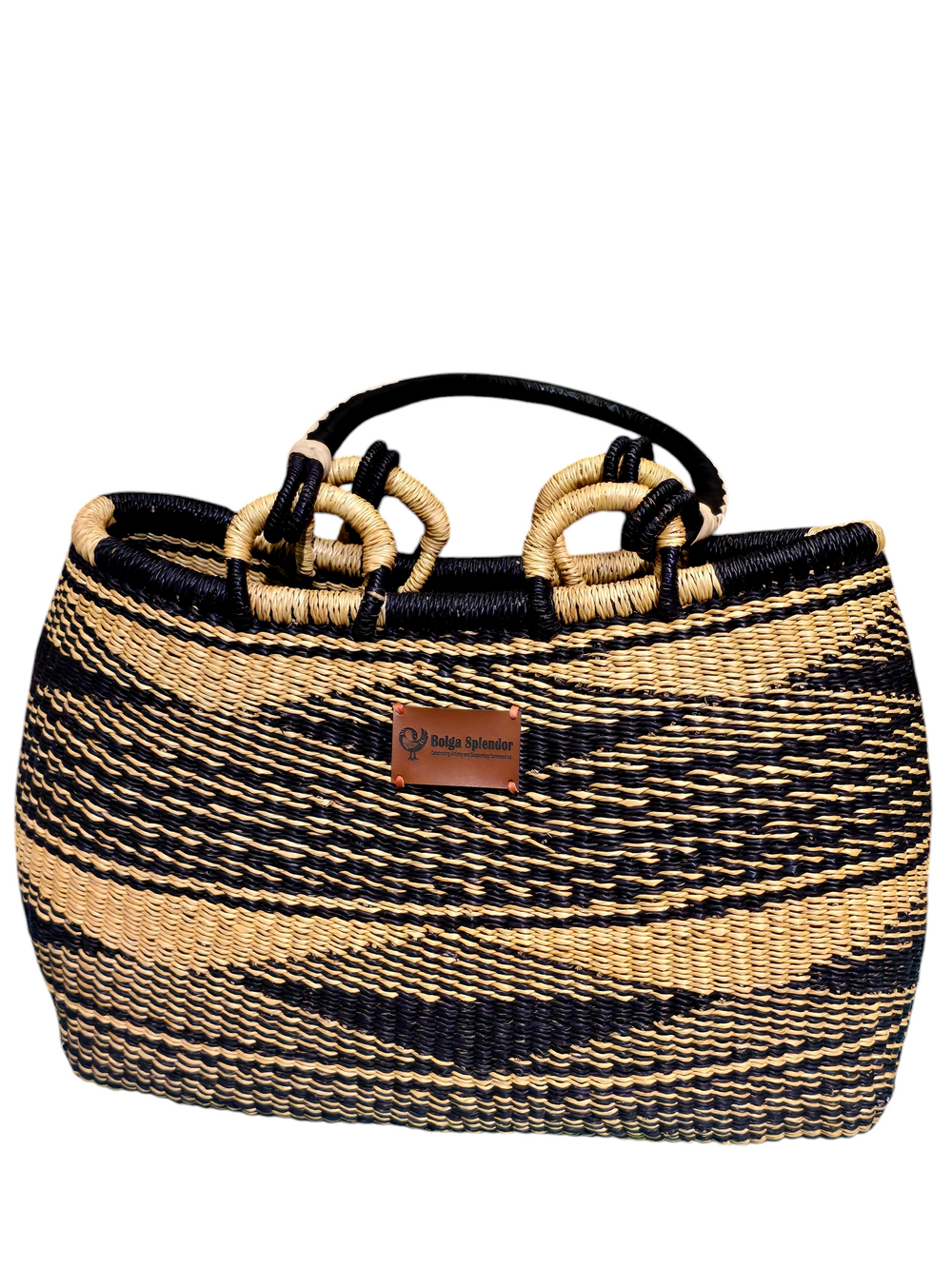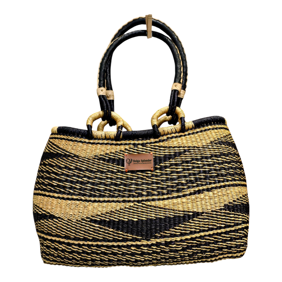 Made from durable elephant grass and featuring bold black and natural patterns, Sanatu is perfect as a statement bag or a stylish storage piece.