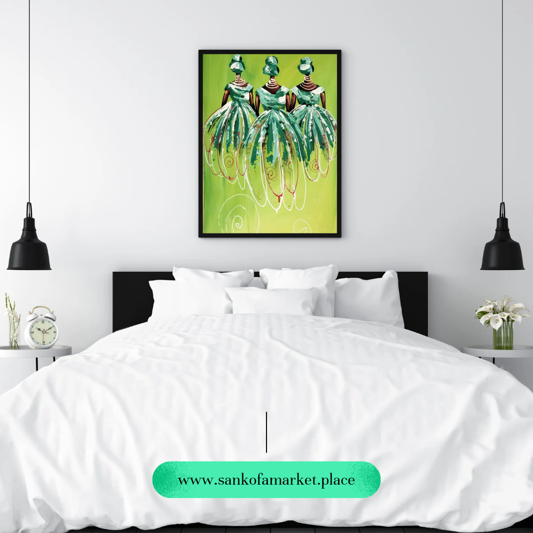 Introducing "Sisters in Stride," this captivating painting that beautifully captures the essence of sisterhood and grace. The lush green dresses symbolize growth, harmony, and the interconnectedness of these graceful figures.