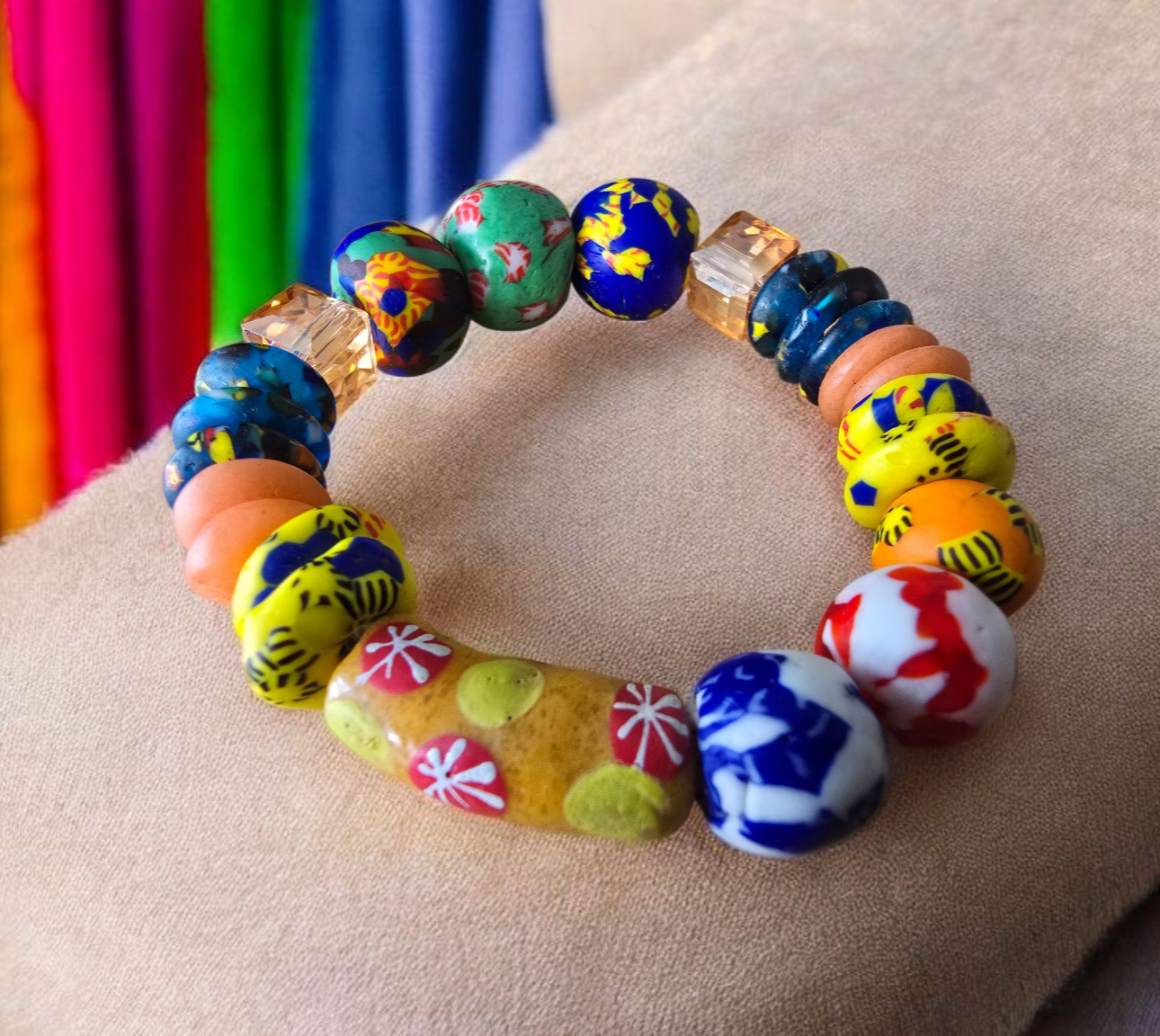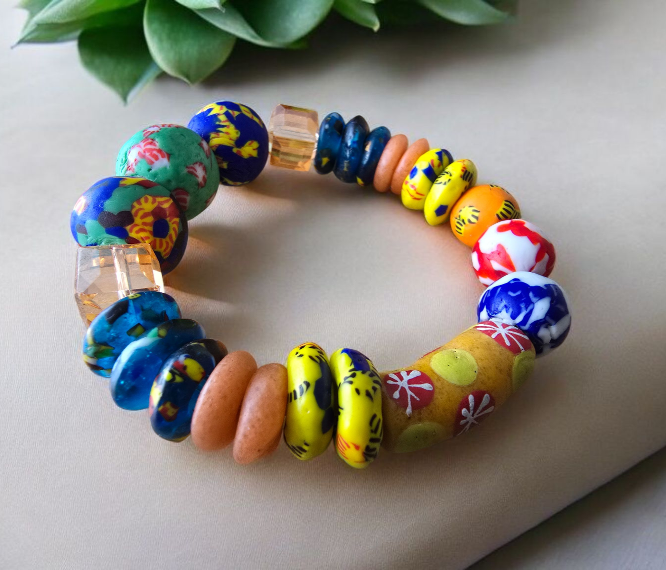 A bold blend of recycled glass and crystal beads handcrafted in honor of Odumasi, Krobo, the birthplace of Ghana’s bead-making tradition. Ethically made by our Fair Trade partner Vida Narh.